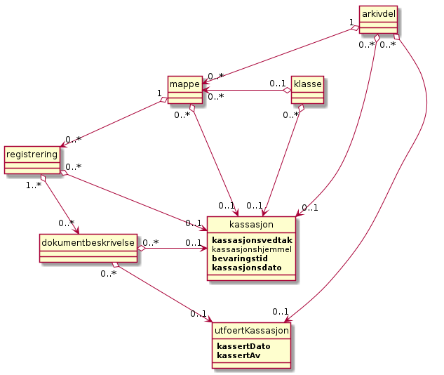 Bevaring og kassasjon er altså i utgangpunktet knyttet til metadata som arves fra klassen, eller eventuelt arkivdelen, til alle underliggende mapper. I tillegg skal det også være mulig å foreta gjennomgående kassasjon av bestemte typer dokumenter. Derfor bør det også være mulig å knytte bevaring og kassasjon til registreringstyper, dokumenttyper eller andre egendefinerte typer. [15]